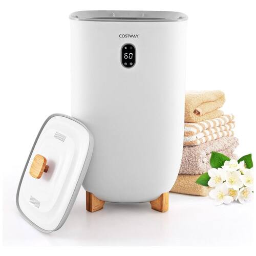 O balde aquecedor possui dois modos de funcionamento – aquecimento e secagem – e é equipado com um temporizador e visor LCD para controle preciso. O aquecimento pode ser ajustado para durar de 20 a 90 minutos, e o modo de secagem pode ser configurado para até 25 horas. As saídas de ar superiores ajudam a eliminar o excesso de umidade, e qualquer água das toalhas molhadas é coletada na bandeja inferior, protegendo o ambiente de danos.