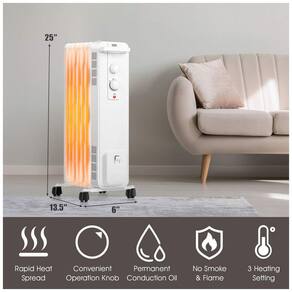 - Rodas Universais Convenientes e Armazenamento de Cabo: Graças ao seu tamanho compacto, alça frontal e rodas universais convenientes, este aquecedor a óleo pode ser facilmente colocado em espaços pequenos, como debaixo de mesas de computador. É fácil de transportar de um cômodo para outro, e o suporte racional frontal para armazenamento do cabo permite um armazenamento sazonal fácil.