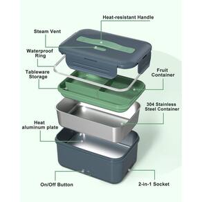 Com uma alça retrátil de borracha, é antiqueimadura e antiderrapante e fácil de transportar. Há um orifício de vapor na capa, com um design de arco circular e um recesso em um lado, que é fácil de abrir à mão. - Design de camada dupla – 2 recipientes empilháveis, o recipiente inferior de aço inoxidável pode conter 1,8 l de comida e a camada superior do recipiente de material PP contém três pequenos compartimentos (1 armazenamento de talheres e 2 compartimentos separados de armazenamento de frutas). O portátil lonchera eléctrica é perfeito para embalar uma variedade de alimentos em porções saudáveis, ajudando você a alcançar uma dieta equilibrada enquanto mantém o sabor autêntico da comida! - Propriedades mais fortes à prova de vazamento – a capa de lancheira elétrica tem travas em todos os quatro lados e sua área de cobertura é projetada para ser maior, tornando-a mais forte e não quebra facilmente. E o anel de vedação de borracha embutido pode garantir que a comida não vaze durante o transporte e mantenha a comida fresca! Não precisa se preocupar com derramamentos de alimentos, mesmo em um ambiente de carro instável! - Desfrute de comida quente e saudável! - Feito de material premium de qualidade alimentar, é o melhor recipiente térmico para embalar alimentos saudáveis. O revestimento externo tem forte resistência ao calor, mesmo que a temperatura interna atinja 100 graus, não estará quente! O aço inoxidável 304 para o tanque interno não tem odor e é durável, reutilizável e fácil de limpar! - Aquecedor de alimentos portátil 4 em 1 – está equipado com 2 adaptadores de energia: um adaptador interno doméstico de 110V/220V, um carro de 12V/24V e um adaptador de caminhão. Conecte a energia para aquecer a comida, pode ser usada em casa/escritório/carro/caminhão. Permite que você desfrute de refeições frescas e quentes, esteja trabalhando ao ar livre ou em ambientes fechados! Também é um presente de elefante branco ideal e emocionante para familiares e amigos! - Alta potência de 100 W e aquecimento rápido: as lancheiras elétricas para adultos adotam um sistema de aquecimento PTC, com temperatura constante e função de ciclo de baixo consumo de calor, pode manter os alimentos aquecidos uniformemente e também bloquear a umidade dos alimentos. Leva apenas 20 a 30 minutos para aquecer rapidamente até a temperatura ideal, desfrute de uma refeição caseira fresca! Elimine a fadiga do seu dia!