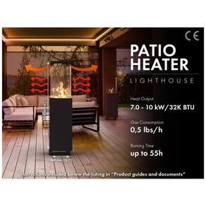 A coluna de fogo para exterior Faro é uma fonte de calor sem fumaça, que utiliza cilindros de gás PropanoLP para proporcionar uma visibilidade de 360 graus da chama. É uma ótima opção para aquecer jardins e áreas externas. A coluna de fogo tem alta eficiência com consumo máximo de gás de 1 lbsh, 32K BTU. Utilizando a botija de gás padrão de 9,07 Quilos, o tempo de queima do pilar de fogo de Faro é de até 45h. Vem com regulador de gás e pode ser sentida de 20 a 120 cm da unidade, dependendo da localização e das condições climáticas. A fogueira portátil é fácil de montar em poucos minutos, com rodas e proteções de vidro à prova de vento. As lareiras a propano externas Planika atendem ou excedem os padrões de segurança e desempenho CSA nos EUA e Canadá, bem como a declaração de conformidade CE UE 2016426 testada pelos Laboratórios Kiwa. A coluna de fogo Faro possui recursos de segurança, como desligamento automático quando inclinada ou tombada, sensor termoelétrico que desliga o fornecimento de gás quando a chama se apaga, freios para travar Faro no lugar e botão de ignição protegido contra acesso não autorizado.