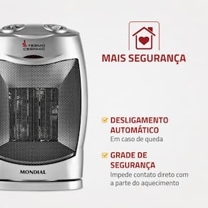 Possui dois niveis de aquecimento e funcao ventilacao, alem de resistencia de ceramica que proporciona aquecimento rapido e eficiente.