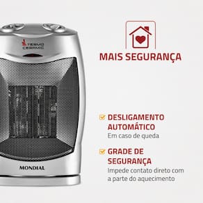 Possui dois níveis de aquecimento e função ventilação, além de resistência de cerâmica que proporciona aquecimento rápido e eficiente.