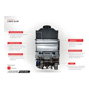 - Acendimento Automático. - Exaustão natural. - Válvula de segurança de gás. - Alimentação à pilha. - Filtro de entrada de água. - Controle de vazão de água. - Proteção contra super aquecimento de água. - Controle de vazão de gás. - Sensor de presença de chama.