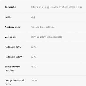 Toalheiro térmico branco - para 01 toalha - 220v esquerdo tamanho mini - Medidas: 350 x 113 x 395mm ou 35 x 11,3 x 39,5cm (Altura x Profundidade x Largura) Toalheiro com Tamanho Especial, fique atento às medidas. O Toalheiro Térmico mantém as toalhas em uso sempre secas e aquecidas, além de desumidificar e de proporcionar uma agradável temperatura ao ambiente! é de fácil instalação, reduz a proliferação de fungos e ácaros nas toalhas, eliminando o mau cheiro. Com baixo consumo de energia e com aquecimento controlado e permanente, não resseca ou danifica a toalha. é uma peça decorativa que se adapta aos mais variados estilos de ambientes. Possui um excelente apelo Ecológico, pois reduz a quantidade de lavagens das toalhas, proporcionando maior vida útil aos tecidos, além de diminuir o consumo de água e produtos químicos liberados no meio ambiente. Material: Epóxi Branco Medidas: 350 x 113 x 395mm ou 35 x 11,3 x 39,5cm (Altura x Profundidade x Largura) Garantia: 03 Anos Segurança Total paras Crianças * Toalheiro com o lado Esquerdo. Voltagem 220v. Obs.: O lado do fio é de acordo com o Toalheiro já fixado na parede. Por exemplo, a foto principal deste anúncio mostra o Toalheiro com o fio do Lado Direito. Mas, neste caso o fio é do lado esquerdo. * Foto meramente ilustrativa, as toalhas não acompanham o produto. benefícios ao consumidor * Reduz a proliferação de fungos e ácaros nas toalhas; * Evita mau cheiro nas toalhas; * Sua toalha seca em muito menos tempo; * Sensação incrível de uma toalha sempre quentinha; * Baixo consumo de energia; * Desumidifica o ambiente; * Diminui a lavagem das toalhas, proporcionando uma maior vida útil para os tecidos; * Peça decorativa; * 3 Anos de garantia; * Produto ecologicamente correto. perguntas mais FREQÜENTES * Oxidação e ferrugem das peças - A pintura exigida para toalheiros é Epóxi a pó, pois resiste a agressividade que encontramos no ambiente do banheiro. * Possibilidade de choque e curto elétrico - Os componentes elétricos são isolados, não havendo possibilidade de choque elétrico, levando em consideração uma instalação adequada. * Queima das toalhas - A potência de cada aparelho faz com que a temperatura seja ideal para secar toalhas, não há possibilidade de queimar os tecidos, apenas não se recomenda o uso de tecidos à base de "nylon" ou sintéticos. * Queimaduras em pessoas desavisadas – A temperatura do toalheiro não provoca queimaduras em pessoas. * Manutenção dos aparelhos – Indicamos a utilização freqüente dos produtos e sua limpeza regular apenas com pano úmido e/ou álcool.