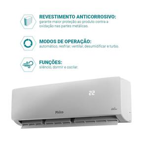 Capacidade de 9000BTUs Ciclo de ar Frio Tecnologia Eco Inverter Compressor rotativo Classificação energética A Gás ecológico R32 Modos de operação: Esfriar, Desumidificar, Ventilar e Automático Funções inteligentes: Dormir, Oscilar, Timer e Turbo Filtro lavável antibacteriano e antifúngico Pintura anticorrosiva Controle digital de temperatura (16°C a 32°C) Compatível com Kit Wi-Fi Philco (vendido separadamente) Baixo nível de ruído: 41 dB (interno) e 57 dB (externo) Design compacto com painel de fácil limpeza Auto Restart e botão de emergência.