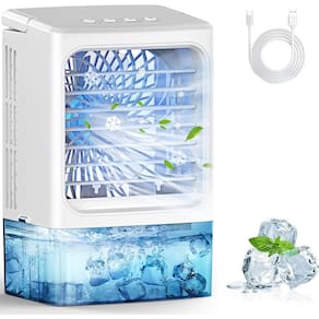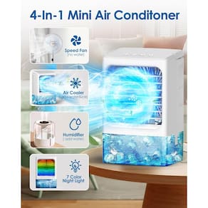 Mini ar condicionado, condicionadores de ar portáteis, umidificador evaporativo, ventilador de resfriamento pessoal silencioso de 3 velocidades, luz noturna LED de 7 cores, temporizador de 4/8H para quarto, escritório, acampamento, carro (branco)