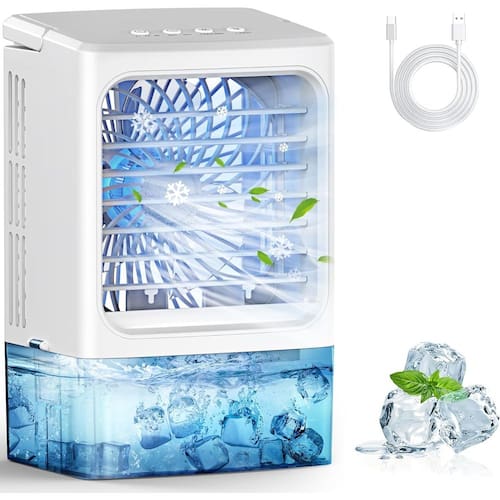 -?Refrigeração rápida?Este mini refrigerador de ar reduz rapidamente a temperatura ambiente em até 45-50 ? em segundos. É sua solução de resfriamento de 3 segundos. Para um impulso extra, adicione água fria ou gelo. É o eficiente refrigerador de ar de mesa que mantém você fresco