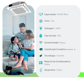 Ar Condicionado Split Cassete 4 Vias - Inverter R-32 - Carrier - 18.000 BTUs - Frio - 220V Monofásico Ar-Condicionado Split Cassete 4 Vias Inverter Carrier R-32 O Ar-Condicionado Split Cassete 4 Vias Inverter Carrier estabelece um novo padrão de climatização para grandes áreas, sendo a escolha ideal para escritórios, lojas, restaurantes e amplos ambientes residenciais. Com um design discreto que se integra perfeitamente ao teto, este modelo combina alta performance com o máximo de conforto térmico. Tecnologia e Conectividade Este modelo redefine a praticidade através da conectividade completa. Com Wi-Fi nativo, você pode controlar e regular a temperatura à distância pelo aplicativo Carrier Air Conditioner. Comando de Voz: Compatível com Alexa e Google Assistant para facilitar o seu dia a dia. Gestão de Energia: Monitore o consumo do seu aparelho em tempo real diretamente pelo app. Programação Inteligente: Utilize a função de Programação Horária e a Curva de Sono para ajustar o ambiente automaticamente conforme sua rotina. Conforto Térmico Exclusivo O grande diferencial deste Cassete é a Função Breezeless (Sem Vento), que elimina o fluxo de ar direto incômodo, dispersando o ar através de micro-furos para uma climatização suave e contínua. Além disso, o controle individual das quatro saídas de ar permite personalizar o direcionamento para garantir conforto sob medida em todos os cantos do recinto. Durabilidade e Eficiência Equipado com o fluido refrigerante R-32, o sistema é mais sustentável e eficiente. A durabilidade é garantida por tecnologias de ponta: Gold Fin®: Proteção extra na unidade externa contra oxidação e corrosão, ideal para regiões litorâneas. Placa Inverter: Desenvolvida para ser resistente à umidade e variações de temperatura, aumentando a vida útil do produto. Compressor DC Rotary: Garante um funcionamento silencioso e com baixo nível de ruído. Principais Funcionalidades Bomba de Dreno Integrada: Oferece maior flexibilidade e facilidade na instalação com drenagem automática. Função Turbo: Resfriamento rápido para atingir a temperatura desejada em menos tempo. Modos de Operação: Versatilidade total com as funções Resfriar, Desumidificar, Ventilar e Aquecer (conforme o modelo escolhido). Velocidades de Ventilação: Quatro opções (Baixa, Média, Alta e Automática) para ajuste preciso. Especificações Técnicas Gerais Capacidades Disponíveis: De 18.000 a 58.000 BTUs. Classificação Energética: Categoria A na maioria dos modelos, garantindo economia na conta de luz. Ciclos: Disponível em versões Frio ou Quente/Frio. Painel: Frontal removível para facilitar a manutenção técnica e limpeza. Garantia e Confiança O produto conta com garantia de 90 dias. No entanto, ao realizar a instalação com uma empresa credenciada da rede Midea Carrier, a garantia é estendida para 3 anos, proporcionando total tranquilidade para o seu investimento.