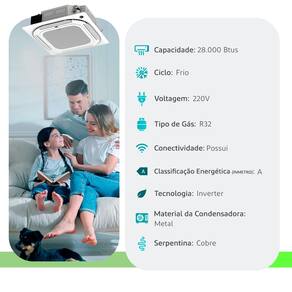 Ar Condicionado Split Cassete 4 Vias - Inverter R-32 - Carrier - 28.000 BTUs - Frio - 220V Monofásico Ar-Condicionado Split Cassete 4 Vias Inverter Carrier: Conforto e Tecnologia para Grandes Ambientes O Ar-Condicionado Split Cassete 4 Vias Inverter Carrier é a solução definitiva para quem busca climatização de alta performance em espaços amplos. Projetado para oferecer uma distribuição de ar impecável em salas de estar extensas, escritórios corporativos, lojas e restaurantes, este modelo combina um design discreto que se integra ao teto com a potência necessária para manter o clima ideal, independentemente da temperatura externa. Tecnologia Inverter e Eficiência Energética Equipado com a avançada tecnologia Inverter, o Cassete Carrier garante uma operação muito mais econômica e silenciosa. O sistema ajusta a velocidade do compressor conforme a necessidade, evitando picos de energia e proporcionando um resfriamento constante. Para maior durabilidade, a Placa Inverter possui proteção reforçada contra umidade e variações de tensão, enquanto a Tecnologia Gold Fin® na unidade externa assegura resistência superior à oxidação e corrosão, sendo ideal inclusive para regiões litorâneas. Experiência Térmica Exclusiva com Função Sem Vento Um dos grandes diferenciais deste modelo é a Função Sem Vento (Breezeless). Através de microfuros estrategicamente posicionados, o aparelho dispersa o ar de forma suave, eliminando o fluxo direto sobre as pessoas e garantindo um conforto térmico contínuo sem as mãos geladas. Além disso, o controle individual das quatro saídas de ar permite personalizar o direcionamento do fluxo, adaptando-se perfeitamente ao layout do seu ambiente. Conectividade e Casa Inteligente Totalmente integrado à era digital, o Cassete Carrier oferece conectividade via aplicativo Carrier Air Conditioner (e suporte ao SmartHome). Controle a temperatura à distância, monitore o consumo de energia em tempo real ou realize agendamentos precisos através da Programação Horária. A compatibilidade com comandos de voz via Alexa e Google Assistant traz a conveniência de ajustar seu clima com apenas uma frase. Recursos Adicionais para o Seu Bem-Estar Modo Turbo: Alcance a temperatura desejada em poucos minutos. Curva de Sono: Ajuste inteligente da temperatura durante a noite para um sono revigorante. Bomba de Dreno Integrada: Facilita a instalação e evita o acúmulo de água, garantindo uma drenagem eficiente. Painel Frontal Removível: Praticidade total no momento da manutenção e limpeza dos filtros.