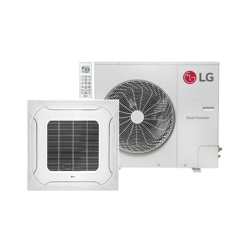 Seu formato cassete permite integração discreta ao teto, favorecendo distribuição de ar ampla sem interferir na organização do ambiente.