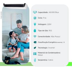 Ar Condicionado Split Teto Inverter - R-32 - LG - 48.000 BTUs - 220V Monofásico Climatização Comercial Leve LG: Eficiência, Tecnologia e Design A Linha Comercial Leve LG oferece soluções de climatização de alto desempenho para ambientes comerciais, combinando tecnologia avançada, sustentabilidade e um design sofisticado. Tecnologia Smart Inverter e Sustentabilidade A linha utiliza a tecnologia Smart Inverter, que proporciona uma operação mais econômica, permitindo uma economia de energia de até 70% em comparação com modelos convencionais. A LG prioriza a sustentabilidade utilizando o refrigerante R32, que é: Ecológico e Eficiente. Proporciona alta eficiência energética com uma quantidade menor de refrigerante. Possui baixo Potencial de Aquecimento Global (GWP) de 632, sendo uma opção mais sustentável em comparação com o refrigerante tradicional R410A (GWP de $2.088$). Conectividade e Controle Inteligente: Módulo Wi-Fi Incluído, Instalação Pelo Cliente Os equipamentos da linha simplificam a rotina com o conceito "Inteligente é simplificar sua rotina". Este aparelho possui compatibilidade Wi-Fi e com a plataforma LG ThinQ™. O módulo de conectividade Wi-Fi necessário acompanha o produto, mas sua instalação física deve ser realizada pelo cliente para habilitar as funções inteligentes. A conectividade permite: Monitorar o consumo de energia. Controlar o aparelho de qualquer lugar e a qualquer momento. Compatibilidade com assistentes de voz, como Ok Google e Alexa. Durabilidade, Instalação e Controle A durabilidade é garantida na condensadora pelas Aletas Resistentes à Corrosão (Black Fin): O revestimento com resina epóxi fornece proteção contra corrosão por poluição do ar e contaminação salina. O filme hidrofílico minimiza a umidade na serpentina e impede o acúmulo de água no trocador de calor, aumentando a resistência à corrosão. A instalação é flexível e mais prática: Comprimento total máximo da tubulação de até 50 metros. Desnível máximo entre condensadora e evaporadora de até 30 metros. O controle é simplificado com a função Controle em Grupo, que permite controlar até 16 unidades internas por meio de um único controle.