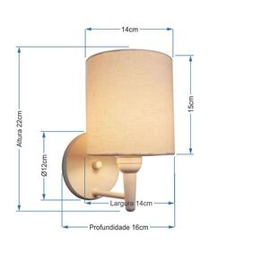 Arandela de parede Cilindrica Md-2009 Base Branca Cúpula em Tecido 14x15cm Algodãp CrúAs arandelas Lustres Vivare são elementos versáteis e elegantes que podem transformar qualquer ambiente em um espaço cheio de estilo. Seja para adicionar uma iluminação suave, destacar uma parede ou criar um efeito de luz diferenciado.Dimensão:Cúpula em Tecido: 14x15cm Arandela de parede Montada: Altura 22cm Largura 14cm Profundidade 16cm Formato: Cilíndrico Tamanho: Pequeno Especificação:Material: Cúpula em Tecido Estrutura em Alumínio Base Parede: Diâmetro 11x1,2cm Resistente: Á Maresia Voltagem: 110V/220V Liga e Desliga: Não Tipo de Soquete: E27 Lâmpada Utilizada: Led Bulbo Até 16w ou Fluorescente Espiral Até 25w Cada Capacidade de Lâmpadas: 1 Observação:Acompanha Lâmpada: Não Possui Led Integrado: Não Garantia: 12 Meses Manual de Instalação: Sim Arandela de parede Montada: Sim Controle de Luminosidade: Não Tipo de Embalagem: Caixa Conservação e Manutenção do Produto:A Limpeza deve ser realizada com o produto desligado. Remova o lustre que pode ser lavado com sabão neutro. Nunca utilize produtos químicos e abrasivos Dica:Antes de comprar o seu produto verifique as medidas, o local onde pretende instalar e se necessário o serviço de um profissional qualificado.