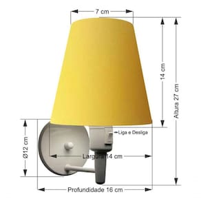 Arandela Cone Md-2013 Branco C/ Inter Liga E Desl Cúpula Em Tecido Amarelo - Bivolt Arandela de parede Cone Md-2013 Branca C/ Inter Liga e Desl Cúpula Tecido AmareloAs arandelas Lustres Vivare são elementos versáteis e elegantes que podem transformar qualquer ambiente em um espaço cheio de estilo. Seja para adicionar uma iluminação suave, destacar uma parede ou criar um efeito de luz diferenciado.Dimensão:Cúpula em Tecido: 14x07x14cm Arandela de parede Montada: Altura 27cm Largura 14cm Profundidade 16cm Formato: Cone Tamanho: Pequeno Especificação:Material: Cúpula em Tecido Estrutura em Alumínio Base Parede: Diâmetro 11x1,2cm Resistente: Á Maresia Voltagem: 110V/220V Liga e Desliga: Interruptor no Soquete Tipo de Soquete: E27 Tipo de Lâmpada: Led Bulbo até 16w ou Fluorescente Espiral até 25w Cada Capacidade de Lâmpadas: 1 Observação:Acompanha Lâmpada: Não Possui Led Integrado: Não Garantia: 12 Meses Manual de Instalação: Sim Arandela de parede Montada: Sim Controle de Luminosidade: Não Tipo de Embalagem: Caixa Conservação e Manutenção do Produto:A Limpeza deve ser realizada com o produto desligado. Remova o lustre que pode ser lavado com sabão neutro. Nunca utilize produtos químicos e abrasivos Antes de comprar o seu produto verifique as medidas, o local onde pretende instalar e se necessário o serviço de um profissional qualificado.