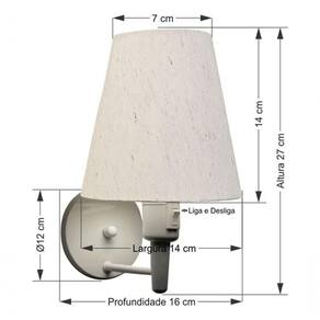 Arandela Cone Md-2013 Branco C/ Inter Liga E Desl Cúpula Em Tecido Linho Bege - Bivolt Arandela de parede Cone Md-2013 Branca C/ Inter Liga e Desl Cúpula Tecido Linho BegeAs arandelas Lustres Vivare são elementos versáteis e elegantes que podem transformar qualquer ambiente em um espaço cheio de estilo. Seja para adicionar uma iluminação suave, destacar uma parede ou criar um efeito de luz diferenciado.Dimensão:Cúpula em Tecido: 14x07x14cm Arandela de parede Montada: Altura 27cm Largura 14cm Profundidade 16cm Formato: Cone Tamanho: Pequeno Especificação:Material: Cúpula em Tecido Estrutura em Alumínio Base Parede: Diâmetro 11x1,2cm Resistente: Á Maresia Voltagem: 110V/220V Liga e Desliga: Interruptor no Soquete Tipo de Soquete: E27 Tipo de Lâmpada: Led Bulbo até 16w ou Fluorescente Espiral até 25w Cada Capacidade de Lâmpadas: 1 Observação:Acompanha Lâmpada: Não Possui Led Integrado: Não Garantia: 12 Meses Manual de Instalação: Sim Arandela de parede Montada: Sim Controle de Luminosidade: Não Tipo de Embalagem: Caixa Conservação e Manutenção do Produto:A Limpeza deve ser realizada com o produto desligado. Remova o lustre que pode ser lavado com sabão neutro. Nunca utilize produtos químicos e abrasivos Antes de comprar o seu produto verifique as medidas, o local onde pretende instalar e se necessário o serviço de um profissional qualificado.