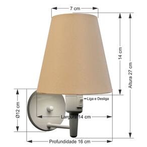 Arandela de parede Cone Md-2013 Branca C/ Inter Liga e Desl Cúpula Tecido PalhaAs arandelas Lustres Vivare são elementos versáteis e elegantes que podem transformar qualquer ambiente em um espaço cheio de estilo. Seja para adicionar uma iluminação suave, destacar uma parede ou criar um efeito de luz diferenciado.Dimensão:Cúpula em Tecido: 14x07x14cm