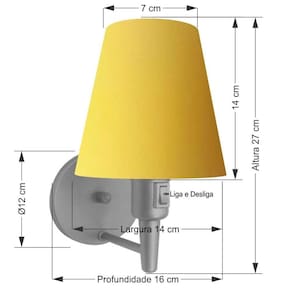 Arandela de parede Cone Md-2013 Cinza C/ Inter Liga e Desl Cúpula Tecido AmareloAs arandelas Lustres Vivare são elementos versáteis e elegantes que podem transformar qualquer ambiente em um espaço cheio de estilo. Seja para adicionar uma iluminação suave, destacar uma parede ou criar um efeito de luz diferenciado.Dimensão:Cúpula em Tecido: 14x07x14cm