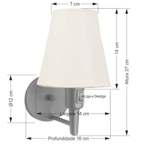 Arandela de parede Cone Md-2013 Cinza C/ Inter Liga e Desl Cúpula Tecido BrancoAs arandelas Lustres Vivare são elementos versáteis e elegantes que podem transformar qualquer ambiente em um espaço cheio de estilo. Seja para adicionar uma iluminação suave, destacar uma parede ou criar um efeito de luz diferenciado.Dimensão:Cúpula em Tecido: 14x07x14cm