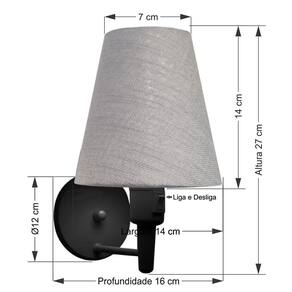Arandela de parede Cone Md-2013 Preta C/ Inter Liga e Desl Cúpula Tecido CinzaAs arandelas Lustres Vivare são elementos versáteis e elegantes que podem transformar qualquer ambiente em um espaço cheio de estilo. Seja para adicionar uma iluminação suave, destacar uma parede ou criar um efeito de luz diferenciado.Dimensão:Cúpula em Tecido: 14x07x14cm Arandela de parede Montada: Altura 27cm Largura 14cm Profundidade 16cm Formato: Cone Tamanho: Pequeno Especificação:Material: Cúpula em Tecido Estrutura em Alumínio Base Parede: Diâmetro 11x1,2cm Resistente: Á Maresia Voltagem: 110V/220V Liga e Desliga: Interruptor no Soquete Tipo de Soquete: E27 Tipo de Lâmpada: Led Bulbo até 16w ou Fluorescente Espiral até 25w Cada Capacidade de Lâmpadas: 1 Observação:Acompanha Lâmpada: Não Possui Led Integrado: Não Garantia: 12 Meses Manual de Instalação: Sim Arandela de parede Montada: Sim Controle de Luminosidade: Não Tipo de Embalagem: Caixa Conservação e Manutenção do Produto:A Limpeza deve ser realizada com o produto desligado. Remova o lustre que pode ser lavado com sabão neutro. Nunca utilize produtos químicos e abrasivos Antes de comprar o seu produto verifique as medidas, o local onde pretende instalar e se necessário o serviço de um profissional qualificado.
