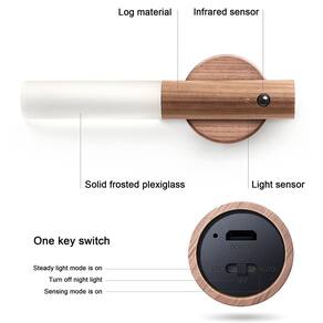 Nome do produto: Luz de sensor inteligente Material do produto: madeira maciça, acrílico, eletrônica Configuração padrão do produto: lâmpada de indução, base, cabo de carregamento Fonte de luz: luz LED Cor da luz: 2700K ~ 300OK luz branca quente Modo de luz: sensor de movimento/liga/desligamento instantâneo Capacidade da bateria: bateria de lítio de 500mAh Potência da luz: 1W Classificação IP do LED: IP20 Atraso de iluminação: 15 segundos Tensão nominal: DC5V 1A Distância de detecção: 4 metros Peso líquido do produto: 100 gramas Tamanho da embalagem: 80 × 43 × 210 mm