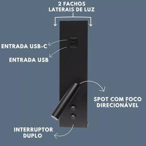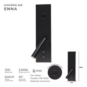 Arandela Led Moderna de Sobrepor com Entrada USB Spot Direcionável Bivolt 3000K Arandela Led Enna é um novo conceito em iluminação, com 2 fachos de luz lateral 3000K branco quente proporciona uma iluminação aconchegante, possui também um spot com foco direcionável que traz elegância e modernidade a peça, além da praticidade em poder ajustar a direção exata do spot de acordo com a necessidade. Com entrada usb, usb-c e duplo é a combinação perfeita entre decoração e funcionalidade, feita inteiramente em alumínio seu design contemporâneo agrega valor estético ao ambiente, e seus componentes eletrônicos de ótima qualidade são responsáveis por garantir sua eficiência. Especificações Técnicas: Potência: 12W Fluxo Luminoso: 640LM Temperatura de cor: 3000K Branco Quente Tensão: 100/240V Bivolt Frequência: 50/60Hz Ângulo de Abertura: 30 Grau de Proteção: IP20 Cor: Preto Altura: 30cm Largura: 8cm Profundidade: 7cm Modelo: Sobrepor Composição: Alumínio e Componentes Eletrônicos Marca: Não Informado