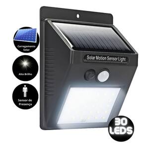 Arandela Luminária 30 Led Energia Solar Sensor De Presença Conteúdo da embalagem: 1x Luminária Solar 30 Led Com Sensor 6w Jardim Prova D'água --------------------- BIG BOOST ------------------------ Arandela Luminária 30 Led Energia Solar Sensor De Presença Luminária Solar 30 LEDs Com Sensor De Movimento, POR TEMPO LIMITADO!! A luminária solar é a solução ideal para o seu ambiente. Graças a placa de energia solar não é necessário puxar fios ou ligar o aparelho na tomada para funcionar, basta fixar em um ambiente externo que ela já está pronta para uso. Contém 30 LEDs de alta potência na cor branca que garantem uma excelente iluminação. O sensor de presença inteligente ativa a luminária automaticamente assim que percebe a presença de alguém no local. A luz só acendera quando estiver em um ambiente escuro, dessa forma ela não aciona quando o ambiente está claro, para não gastar a bateria. Luminária solar para jardim e ambientes externos Placa de energia solar 30 LEDs de alta luminosidade Sensor de presença automático Resistente a água Fácil de instalar, não é necessário puxar fios ou ligar na tomada Pode ser fixada na parede através da bucha e do parafuso que vão dentro da caixa ESPECIFICAÇÕES: Potência: 0,65 Watts Material: Plástico ABS Sensor de luz Solar de Energia: 2,4 Watts, 270 lumens Fonte de energia: Solar 20 LEDs SMD 2835 Bateria: 3. 7 V 18650 1200 mah Painel Solar: 6 V/1 W Nível de proteção Prova dágua: IP65 Distância de detecção: 3 m Autonomia de iluminação: Até 4 horas Tempo de vida do LED: 50000 h Tipo de instalação: Fixado Na Parede : Botão Sensor de movimento ângulo: 120º on/off Tamanho do produto: 124x95x48mm Peso: 0. 15 kg Tamanho do produto: 12,4 x 9,5 x 4,8 CM A, L, P CONTÉM NA CAIXA: 01 Luminária Solar 01 Bucha 01 Parafuso 01 Manual Marca: Não Informado