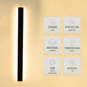 transforme seu ambiente com a arandela profile, um modelo sofisticado que combina design moderno e iluminação eficiente. Seu acabamento em preto proporciona um toque elegante e contemporâneo para qualquer espaço. Destaques do produto -com um design moderno e sofisticado - combinando com qualquer decoração e ambiente. -modelo : ar 6137 -cor es : preto pintura pó . -material de alta qualidade : feita com um alumínio resistente para maior durabilidade. -acompanha fita de led embutida. -ideal para diferentes ambientes - perfeita para quartos, salas, escritórios e áreas gourmet. -peça com acionamento em instalado na residência. -modelo não recarregável. - de 3 meses. Especificações técnicas Ar 6145 profile 65x40x985mm 3000k 20w 220v pt Material : alumínio Cor : preto Iluminação : fita de led Led incluso 3000k branco quente Potência: 20w Voltagem : 220v Medida : 650mm x 40mm x 985mm Peso : 700gr Quantidade : 1 produto. Observação : o produto necessita de instalação elétrica para o funcionamento adequado. Conteúdo da embalagem : 1 luminária. Marca: Não Informado Ean: 7893313002990