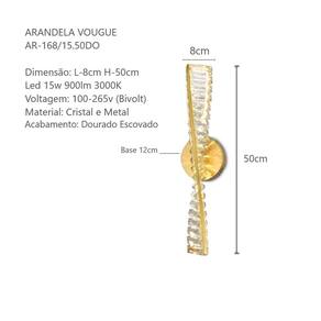A Arandela Led Vougue da + Luz Iluminação é ideal para fazer composições e decorar diversos ambientes. A combinação perfeita do acabamento na cor dourado escovado, junto com a luz do Led projetada no cristal, dando um incrível visual brilhante e moderno. Venha se surpreender com essa grande Joia da Iluminação. Material: Metal e Cristal Cor: Estrutura Dourado Escovado Cristal: Cor Transparente 8cm Medidas: 50cm x 8cm Base de Fixação: 12cm Iluminação: Led 15W Luz Amarelada 3000k Já integrado ao Produto Lúmens: 900Lm Voltagem: Bivolt Marca: + LUZ Itens inclusos: 1 Arandela Led de Cristal Marca: Não Informado Ean: 7898583879709