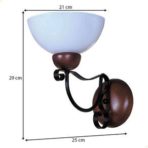 A arandela possui 29 cm de altura, 25 cm de afastamento da parede e o vidro tem 21 cm de diâmetro, sendo ideal para paredes de corredores, salas, áreas externas cobertas ou cabeceiras.