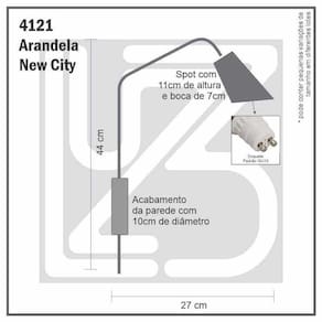 Descrição Técnica: - Modelo: ARANDELA NEW CITY - Acabamento: Pintura a pó - Material: Aço e Alumínio - Tamanho (PxA): 44 cm x 27 cm - Interruptor: Não - Soquete: Padrão GU10 - Bivolt: Sim **LÂMPADA NÃO INCLUSA NO PRODUTO**
