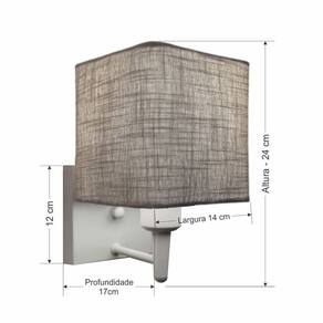 Arandela de parede Quadrada Md-2006 Branco Cúpula em Tecido Rustico Cinza - BivoltAs arandelas Lustres Vivare são elementos versáteis e elegantes que podem transformar qualquer ambiente em um espaço cheio de estilo. Seja para adicionar uma iluminação suave, destacar uma parede ou criar um efeito de luz diferenciado.Dimensão:Cúpula em Tecido: 15x14x14cm Arandela de parede Montada: Altura 24cm Largura 14cm Profundidade 17cm Formato: Quadrado Tamanho: Pequeno Especificação:Material: Cúpula em Tecido Estrutura em Alumínio Base Parede: Quadrado 12x12x2cm Resistente: Á Maresia Voltagem: 110V/220V Liga e Desliga: Não Tipo de Soquete: E27 Lâmpada Utilizada: Led Bulbo Até 16w ou Fluorescente Espiral Até 25w Cada Capacidade de Lâmpadas: 1 Observação:Acompanha Lâmpada: Não Possui Led Integrado: Não Garantia: 12 Meses Manual de Instalação: Sim Arandela de parede Montada: Sim Controle de Luminosidade: Não Tipo de Embalagem: Caixa Conservação e Manutenção do Produto:A Limpeza deve ser realizada com o produto desligado. Remova o lustre que pode ser lavado com sabão neutro. Nunca utilize produtos químicos e abrasivos Dica:Antes de comprar o seu produto verifique as medidas, o local onde pretende instalar e se necessário o serviço de um profissional qualificado.