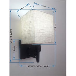Arandela de parede Quadrada Md-2019 Preta C/ Inter Liga E Desliga Cúpula Tecido Rustico BegeAs arandelas Lustres Vivare são elementos versáteis e elegantes que podem transformar qualquer ambiente em um espaço cheio de estilo. Seja para adicionar uma iluminação suave, destacar uma parede ou criar um efeito de luz diferenciado.Dimensão:Cúpula em Tecido: 15x14x14cm Arandela de parede Montada: Altura 29cm Largura 14cm Profundidade 17cm Formato: Quadrado Tamanho: Pequeno Especificação:Material: Cúpula em Tecido Estrutura em Alumínio Base Parede: Quadrado 12x12x2cm Resistente: Á Maresia Voltagem: 110V/220V Liga e Desliga: Interruptor no Soquete Tipo de Soquete: E27 Lâmpada Utilizada: Led Bulbo Até 16w ou Fluorescente Espiral Até 25w Cada Capacidade de Lâmpadas: 1 Observação:Acompanha Lâmpada: Não Possui Led Integrado: Não Garantia: 12 Meses Manual de Instalação: Sim Arandela de parede Montada: Sim Controle de Luminosidade: Não Tipo de Embalagem: Caixa Conservação e Manutenção do Produto:A Limpeza deve ser realizada com o produto desligado. Remova o lustre que pode ser lavado com sabão neutro. Nunca utilize produtos químicos e abrasivos Dica:Antes de comprar o seu produto verifique as medidas, o local onde pretende instalar e se necessário o serviço de um profissional qualificado.