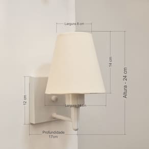 Arandela de parede Quadrada Md-2034 Branco Cúpula em Tecido Cone Algodão Crú - BivoltAs arandelas Lustres Vivare são elementos versáteis e elegantes que podem transformar qualquer ambiente em um espaço cheio de estilo. Seja para adicionar uma iluminação suave, destacar uma parede ou criar um efeito de luz diferenciado.Dimensão: Cúpula em Tecido: 14x07x14cm Arandela de parede Montada: Altura 24cm Largura 14cm Profundidade 17cm Formato: Quadrado / Cone Tamanho: Pequeno Especificação: Material: Cúpula em Tecido Estrutura em Alumínio Base Parede: Quadrado 12x12x2cm Resistente: Á Maresia Voltagem: 110V/220V Liga e Desliga: Não Tipo de Soquete: E27 Lâmpada Utilizada: Led Bulbo Até 16w ou Fluorescente Espiral Até 25w cada Capacidade de Lâmpadas: 1 Observação: Acompanha Lâmpada: Não Possui Led Integrado: Não Garantia: 12 Meses Manual de Instalação: Sim Arandela de parede Montada: Sim Controle de Luminosidade: Não Tipo de Embalagem: Caixa Conservação e Manutenção do Produto: A Limpeza deve ser realizada com o produto desligado. Remova o lustre que pode ser lavado com sabão neutro. Nunca utilize produtos químicos e abrasivos Dica: Antes de comprar o seu produto verifique as medidas, o local onde pretende instalar e se necessário o serviço de um profissional qualificado.