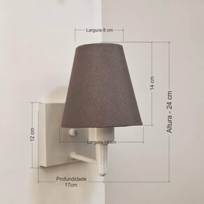 Arandela Quadrada Md-2034 Branco Cúpula Em Tecido Cone Cinza Escuro - Bivolt Arandela de parede Quadrada Md-2034 Branco Cúpula em Tecido Cone Cinza Escuro - BivoltAs arandelas Lustres Vivare são elementos versáteis e elegantes que podem transformar qualquer ambiente em um espaço cheio de estilo. Seja para adicionar uma iluminação suave, destacar uma parede ou criar um efeito de luz diferenciado.Dimensão: Cúpula em Tecido: 14x07x14cm Arandela de parede Montada: Altura 24cm Largura 14cm Profundidade 17cm Formato: Quadrado / Cone Tamanho: Pequeno Especificação: Material: Cúpula em Tecido Estrutura em Alumínio Base Parede: Quadrado 12x12x2cm Resistente: Á Maresia Voltagem: 110V/220V Liga e Desliga: Não Tipo de Soquete: E27 Lâmpada Utilizada: Led Bulbo Até 16w ou Fluorescente Espiral Até 25w cada Capacidade de Lâmpadas: 1 Observação: Acompanha Lâmpada: Não Possui Led Integrado: Não Garantia: 12 Meses Manual de Instalação: Sim Arandela de parede Montada: Sim Controle de Luminosidade: Não Tipo de Embalagem: Caixa Conservação e Manutenção do Produto: A Limpeza deve ser realizada com o produto desligado. Remova o lustre que pode ser lavado com sabão neutro. Nunca utilize produtos químicos e abrasivos Dica: Antes de comprar o seu produto verifique as medidas, o local onde pretende instalar e se necessário o serviço de um profissional qualificado.