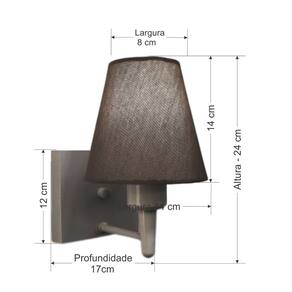 Arandela de parede Quadrada Md-2034 Cinza Cúpula em Tecido Cone Cinza Escuro - BivoltAs arandelas Lustres Vivare são elementos versáteis e elegantes que podem transformar qualquer ambiente em um espaço cheio de estilo. Seja para adicionar uma iluminação suave, destacar uma parede ou criar um efeito de luz diferenciado.Dimensão: Cúpula em Tecido: 14x07x14cm Arandela de parede Montada: Altura 24cm Largura 14cm Profundidade 17cm Formato: Quadrado / Cone Tamanho: Pequeno Especificação: Material: Cúpula em Tecido Estrutura em Alumínio Base Parede: Quadrado 12x12x2cm Resistente: Á Maresia Voltagem: 110V/220V Liga e Desliga: Não Tipo de Soquete: E27 Lâmpada Utilizada: Led Bulbo Até 16w ou Fluorescente Espiral Até 25w cada Capacidade de Lâmpadas: 1 Observação: Acompanha Lâmpada: Não Possui Led Integrado: Não Garantia: 12 Meses Manual de Instalação: Sim Arandela de parede Montada: Sim Controle de Luminosidade: Não Tipo de Embalagem: Caixa Conservação e Manutenção do Produto: A Limpeza deve ser realizada com o produto desligado. Remova o lustre que pode ser lavado com sabão neutro. Nunca utilize produtos químicos e abrasivos Dica: Antes de comprar o seu produto verifique as medidas, o local onde pretende instalar e se necessário o serviço de um profissional qualificado.
