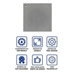 ESPECIFICAÇÕES TÉCNICAS ARANDELA: - Recorte redondo para alto-falantes de 6,5 polegadas que facilita o alinhamento; - Fabricada em material resistente de alta durabilidade; - Fácil instalação direta em gessos; - Medidas da arandela: 22 x 22 cm; - Acabamento na cor branca.