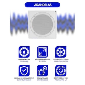 Especificações técnicas arandela: - recorte redondo para alto-falantes de 6,5 polegadas que facilita o alinhamento; - fabricada em material resistente de alta durabilidade; - fácil instalação direta em gessos; - medidas da arandela: 22 x 22 cm; - acabamento na cor branca.