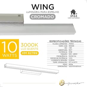 Com a Arandela Wing, a iluminação perfeita para seu espelho ou quadro está garantida Com LED integrado de 3000K, 10W e luz leitosa, seu ambiente ficará mais elegante e sofisticado. Além disso, seu acabamento cromado em alumínio e difusor em acrílico garantem qualidade e durabilidade. E o melhor de tudo: com grau de proteção IP44, pode ser utilizada em áreas úmidas sem preocupação