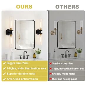 Este conjunto de duas arandelas de parede apresenta corpos de luminárias com acabamento preto e dourado e cúpulas de vidro transparente espesso. Com um design limpo e adaptável, esta iluminação de parede é ideal para melhorar a iluminação da sua casa e se integra perfeitamente a vários estilos de decoração. Feito com materiais de alta qualidade, o corpo totalmente metálico garante segurança e durabilidade para uso a longo prazo. Os espessos abajures de vidro transparente protegem a lâmpada e garantem a máxima saída de luz. Além disso, o tratamento de superfície aprimorado não só adiciona um toque elegante, mas também inclui revestimentos resistentes a arranhões e manchas, garantindo que a iluminação do banheiro possa manter sua aparência imaculada por um longo período. Com soquetes de cerâmica resistentes ao calor, essas arandelas de parede são projetadas para suportar o calor do uso prolongado de lâmpadas, reduzindo a frequência de substituições de lâmpadas e fornecendo uma solução de iluminação durável e econômica. Essas arandelas de parede para banheiro de 2 unidades oferecem uma aparência elegante e rústica, adequadas para vários locais, como espelhos de banheiro, corredores, entradas, quartos, armários, salas de estar, armários de espelho, penteadeiras e corredores. Eleve a atmosfera da sua casa e de outros espaços com esta solução de iluminação elegante e adaptável.