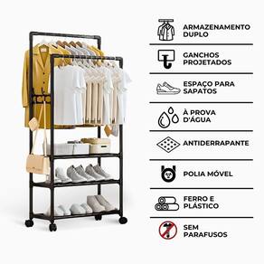 - Prateleiras Removíveis: Equipado com prateleiras práticas, a arara oferece mais versatilidade para armazenar sapatos, bolsas, caixas organizadoras e outros acessórios. As prateleiras podem ser ajustadas conforme a necessidade, proporcionando flexibilidade no armazenamento.