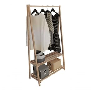 ITENS INCLUSOS:Uma Arara com duas prateleiras e um cabideiro em madeira de Pinus - ITENS DECORATIVOS NÃO INCLUSOS.