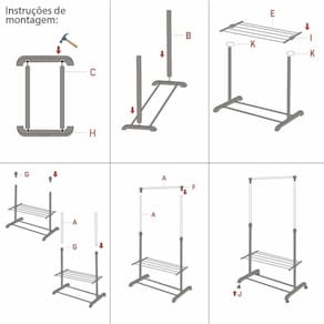 Com a arara, você pode organizar sua casa de forma simples e eficaz, é um acessório ideal para lavanderias, quartos e até mesmo lojas de roupas. Fácil de montar, sem necessidade de ferramentas, basta seguir as instruções de montagem na embalagem. É feito de materiais duráveis e de alta qualidade, possui tubos de aço e altura regulável e seus encaixem, assim como sua base e rodinhas são em polipropileno. Possui rodízios que auxiliam no transporte. Conta com uma sapateira para você guardar os sapatos e duas barras estruturais para apoiar objetos maiores.