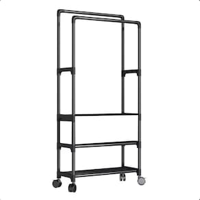 Outra característica que torna este produto indispensável são suas rodinhas de alta qualidade, que garantem mobilidade total. Seja para movimentar entre cômodos, reorganizar o espaço ou utilizá-lo em diferentes ambientes, o transporte se torna leve e fácil. Se você busca uma combinação de praticidade, organização e estilo, esta arara de roupas multifuncional é a escolha perfeita para você