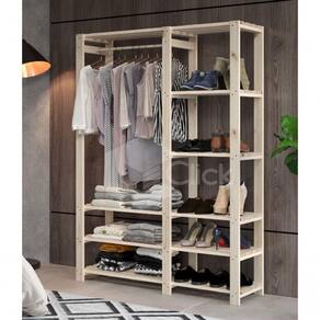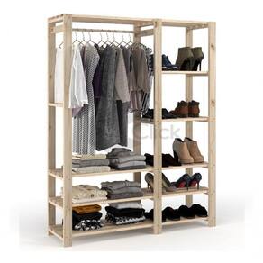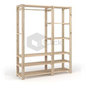 Estante arara com prateleiras e estrutura em madeira maciça de Pinus.