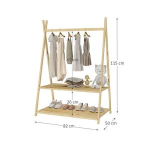 O Cabideiro Infantil Para Crianças Madeira Maciça Danilo possui estrutura em madeira natural e prateleiras brancas, trazendo leveza e um toque moderno para quartos montessorianos.