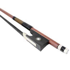 - Arco estudante para violino - Crina de mongolia preta - Talão de ébano - Detalhes em concha de madre pérola - Guarnição de couro e fios encapados - Peso de 66,4g - Ponto de equilíbrio a 19cm do talão - Tamanho 4/4 - Fabricado com madeira de maçaranduba