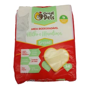 Areia Biodegradável Milho E Mandioca Grossa Great Pets 3,8kg A Areia Biodegradável de Milho e Mandioca da Great Pets é uma escolha sustentável e eficiente para cuidar da higiene do seu gato. Feita exclusivamente de 100% Milho e Mandioca, esta areia é fabricada nacionalmente em pacotes de 3,8kg. Ideal para todas as raças e tamanhos de gatos, caracteriza-se por sua composição natural, orgânica, atóxica e aglomerante. Proporciona descarte ecológico, excelente capacidade de absorção com baixo índice de umidade, formação de torrão firme e instantânea, e alto rendimento, durando até 30 dias para um gato. Além disso, oferece ótimo controle de odores, e a versão Grossa reduz o rastro, evitando que os grãos fiquem retidos nas patas do seu animal. A fácil limpeza da caixa de areia, que não gruda, e o baixo desperdício, sendo 100% absorvível, garantem praticidade no dia a dia. A cor clara da areia também permite identificar alterações na urina do gato, facilitando a monitorização da saúde do seu animal de estimação. Escolha a Areia Biodegradável de Milho e Mandioca da Great Pets para uma solução sustentável, eficiente e prática na higiene do seu gato! Informações: - 100% Milho e Mandioca - Forma Torrões Firmes - Descarte Ecológico - Controle de Odor - Rende Muito Mais - Baixo Indice de Poeira Conteúdo: - 1 Pacote Areia Biodegradável Grossa