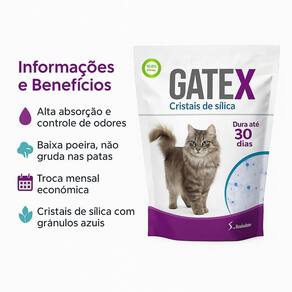 Areia de gato sílica cristais gatex fácil limpeza antiodor Areia sanitária gatex - cristais de sílica grossos para gatos A gatex é a areia de sílica ideal para quem busca praticidade e higiene no dia a dia. Seus cristais grossos de sílica gel entregam alta absorção e excelente controle de odores, mantendo a bandeja sempre seca e confortável para o gato. A granulação maior reduz a aderência nas patinhas e ajuda a evitar que o produto se espalhe pela casa.