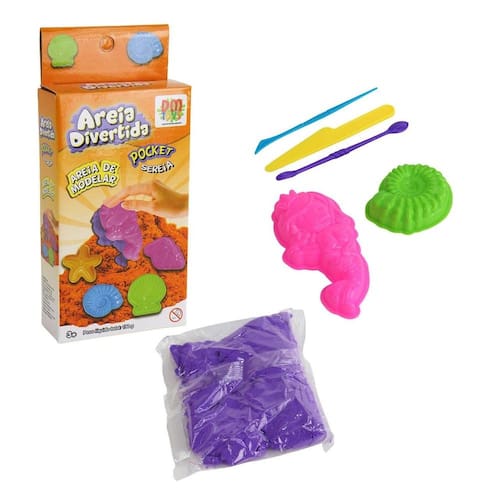 Areia Mágica 150g com 2 Moldes Sereia Sortid Brinquedo sensorial Fidget Toys Areia Divertida Edição de Bolso Sereia, conhecida como areia satisfatória, permite criar moldes, aliviar o desconforto e entreter a criançada. Contém: 2 Moldes de Plástico, 3 Ferramentas de Plástico, 1 Saco com Areia de Modelar de 150gr.\nMarca : DM Tipo de material : Areia de quartzo, Plástico Cores ou Estampa : diversos Dimensões do Produto : 19,5 X 9 X 3,5 CM Peso Bruto (Gramas) : 0.194 Marca: Não Informado