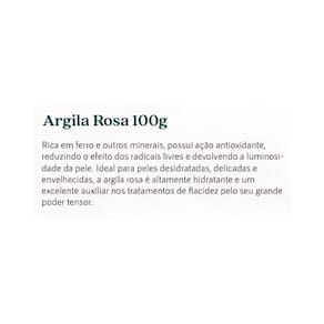 Rica em ferro e outros minerais, possui ação antioxidante, reduzindo o efeito dos radicais livres e devolvendo a luminosidade da pele. Ideal para peles desidratadas, delicadas e envelhecidas, a argila rosa é altamente hidratante e um excelente auxiliar nos tratamentos de flacidez pelo seu grande poder tensor.