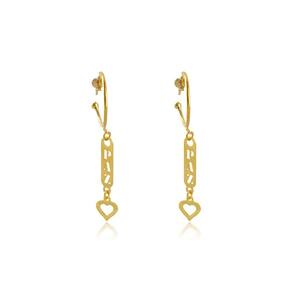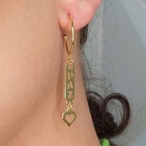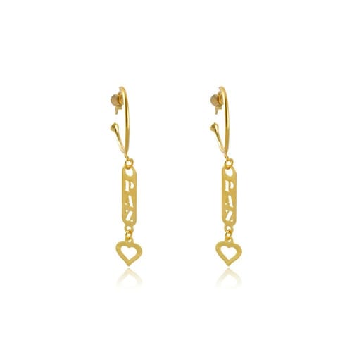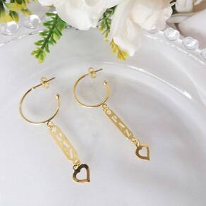 Esse brinco é composto por uma argolinha articulada, seguido da palavra PAZ escrita na vertical em uma chapa e finalizando com um pequeno coração vazado.